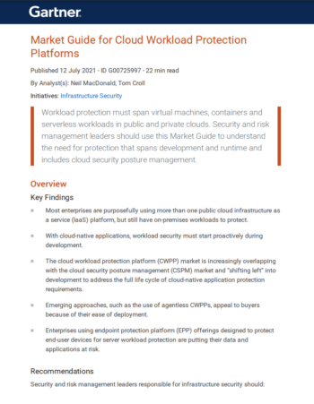 * Gartner, “Market Guide for Cloud Workload Protection Platforms”, Neil MacDonald, Tom Croll, 12 July 2021. Gartner does not endorse any vendor, product or service depicted in its research publications, and does not advise technology users to select only those vendors with the highest ratings or other designation. Gartner research publications consist of the opinions of Gartner’s research organization and should not be construed as statements of fact. Gartner disclaims all warranties, expressed or implied, with respect to this research, including any warranties of merchantability or fitness for a particular purpose. GARTNER is a registered trademark and service mark of Gartner, Inc. and/or its affiliates in the U.S. and internationally, and is used herein with permission. All rights reserved.